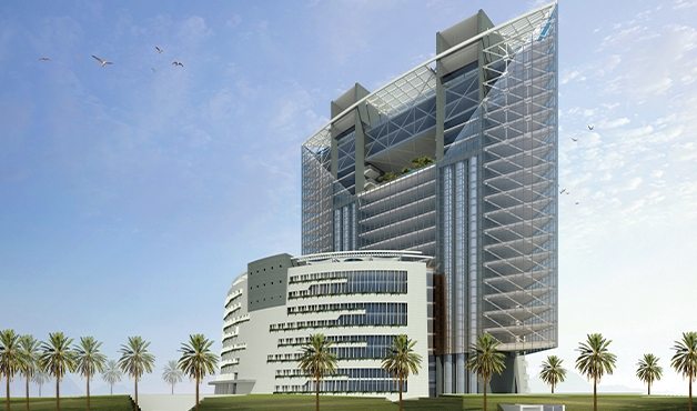 Surrounding the podium, there is an expansive garden on a green slope containing services and the parking facility. At the top of the project, the executive offices and the general manager's office are designed in the form of a bridge that overlooks the bay of Yanbu Al Sinaiyah.