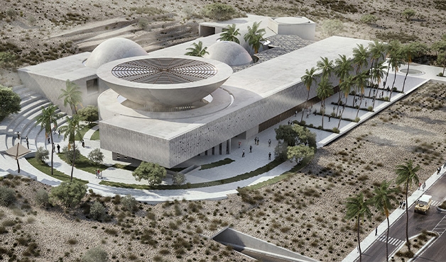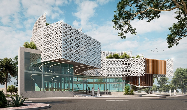 This building, through its volumetrics, encapsulates both history and a vision towards the future. The project's base is a circular podium housing various administrative departments, while the blade-shaped tower stands out with its glass facade and suspended metal structure, symbolizing the grandeur of the industry represented by the Royal Commission of Jubail and Yanbu.