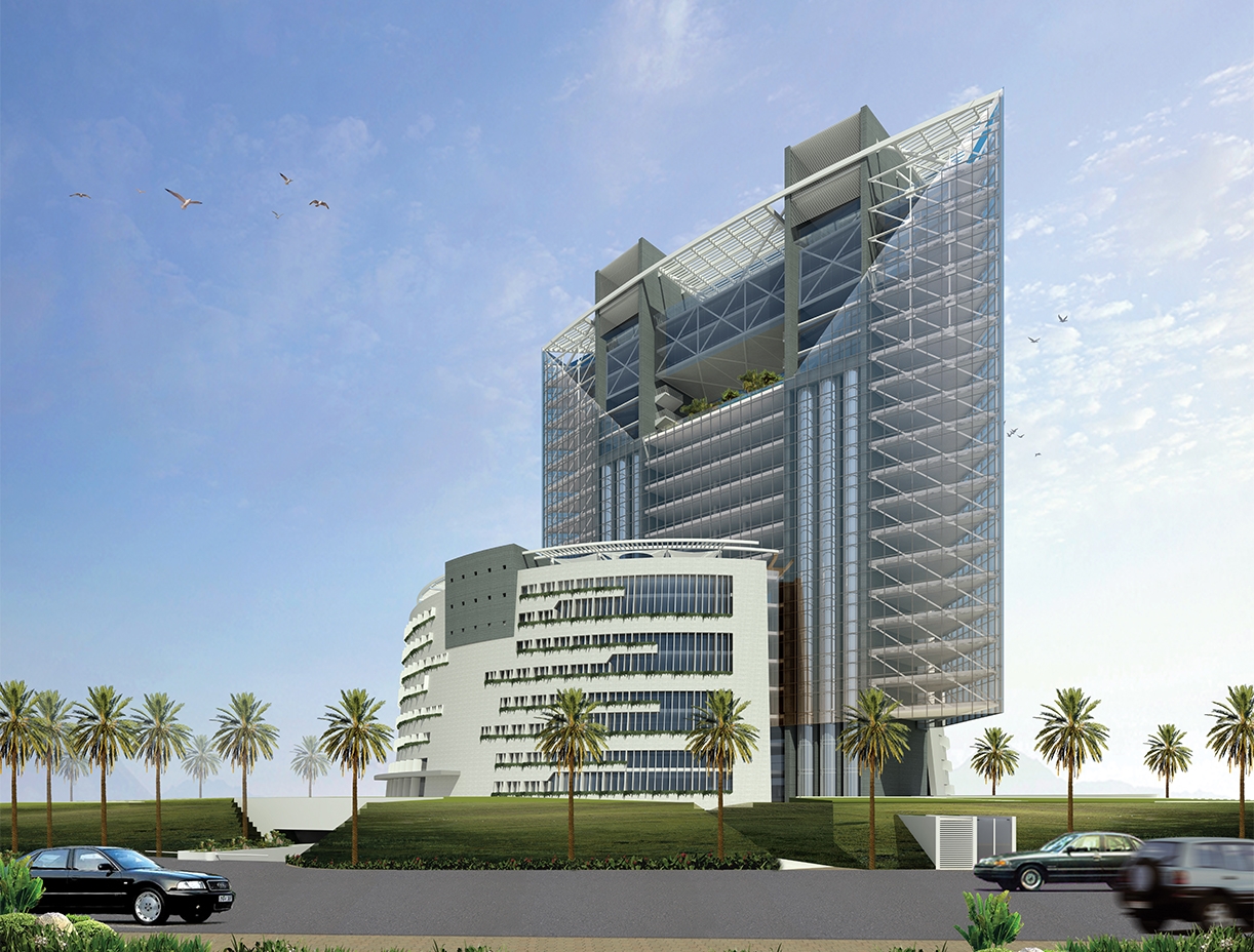 Surrounding the podium, there is an expansive garden on a green slope containing services and the parking facility. At the top of the project, the executive offices and the general manager's office are designed in the form of a bridge that overlooks the bay of Yanbu Al Sinaiyah.
