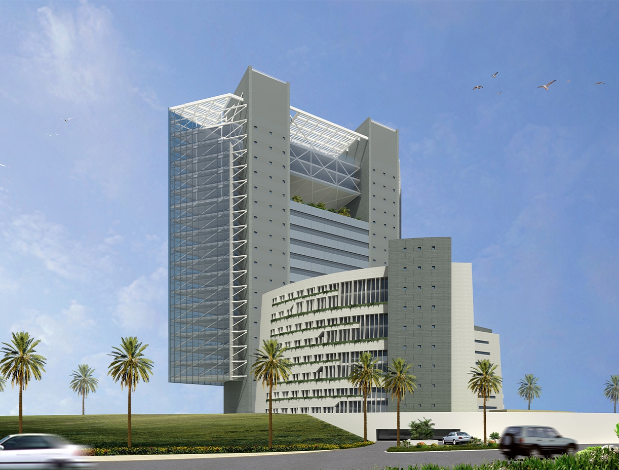 This building, through its volumetrics, encapsulates both history and a vision towards the future. The project's base is a circular podium housing various administrative departments, while the blade-shaped tower stands out with its glass facade and suspended metal structure, symbolizing the grandeur of the industry represented by the Royal Commission of Jubail and Yanbu.