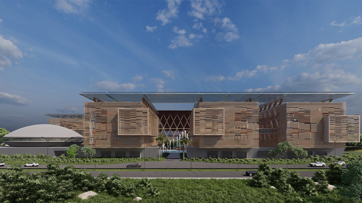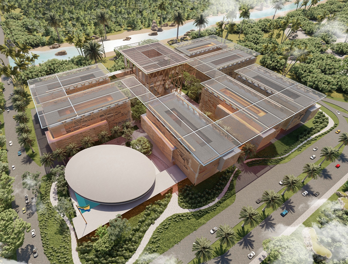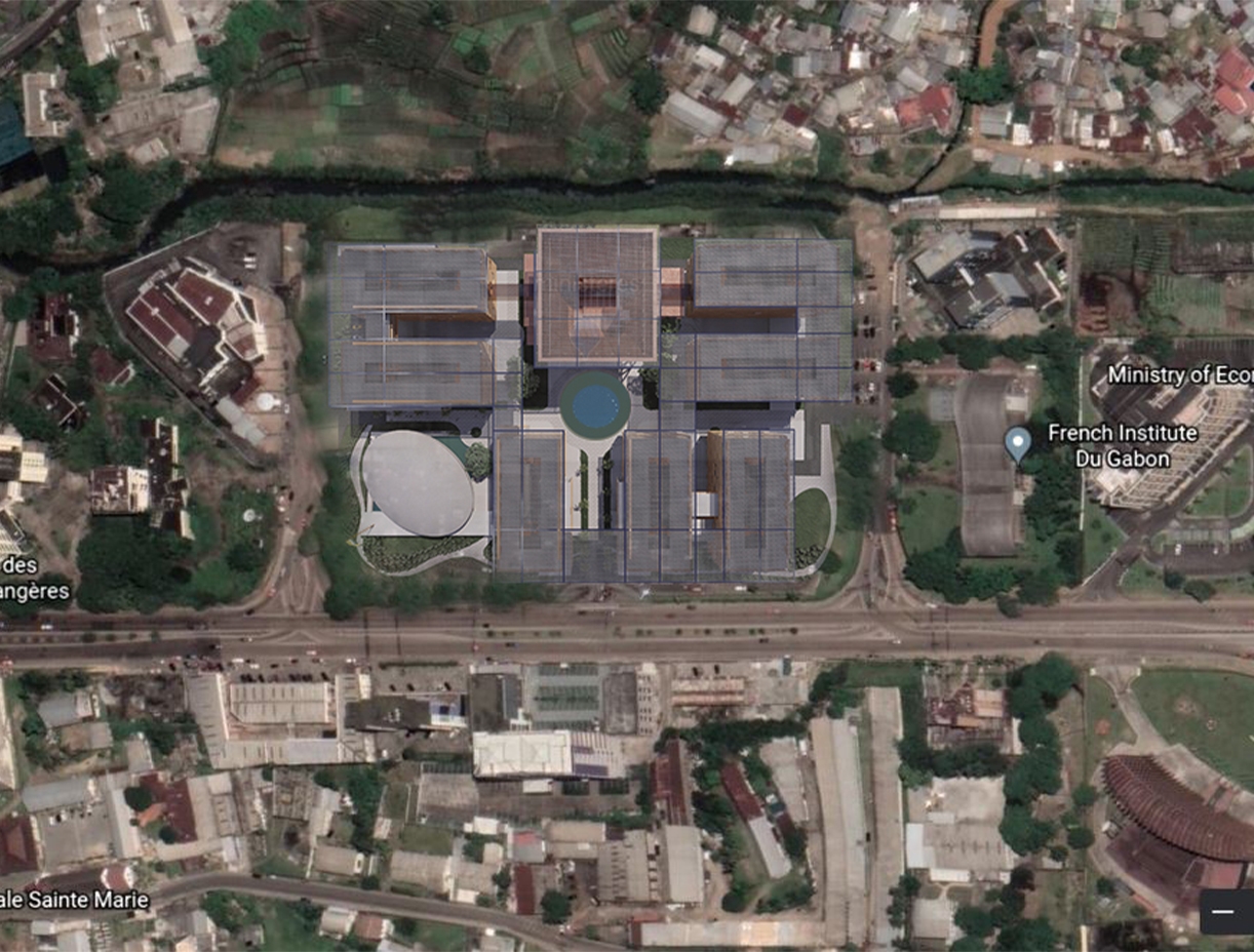 The main access leads to a central area where the focal point is the main building, symbolizing the heart of government operations. Adjacent to this, the conference area takes on an elliptical shape, evoking a sense of unity and collaboration. The entire complex is strategically organized to accommodate various ministries, each contributing to the overall efficiency and synergy of the government operations. The elliptical shape of the conference area not only creates a striking architectural feature but also promotes an inclusive environment for discussions and decision-making. The Ministerial Complex stands as a beacon of governmental innovation in Gabon, a testament to thoughtful design that fosters collaboration, efficiency, and a sense of national pride.