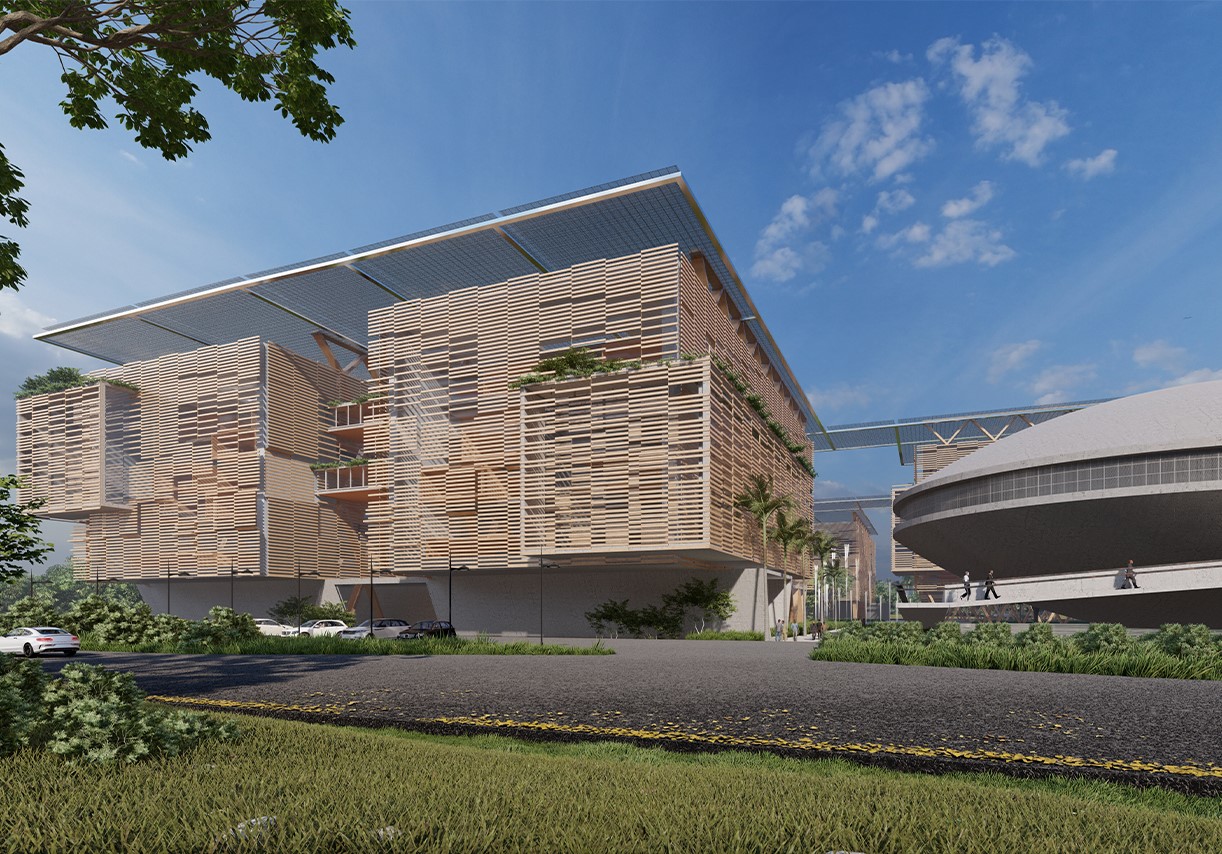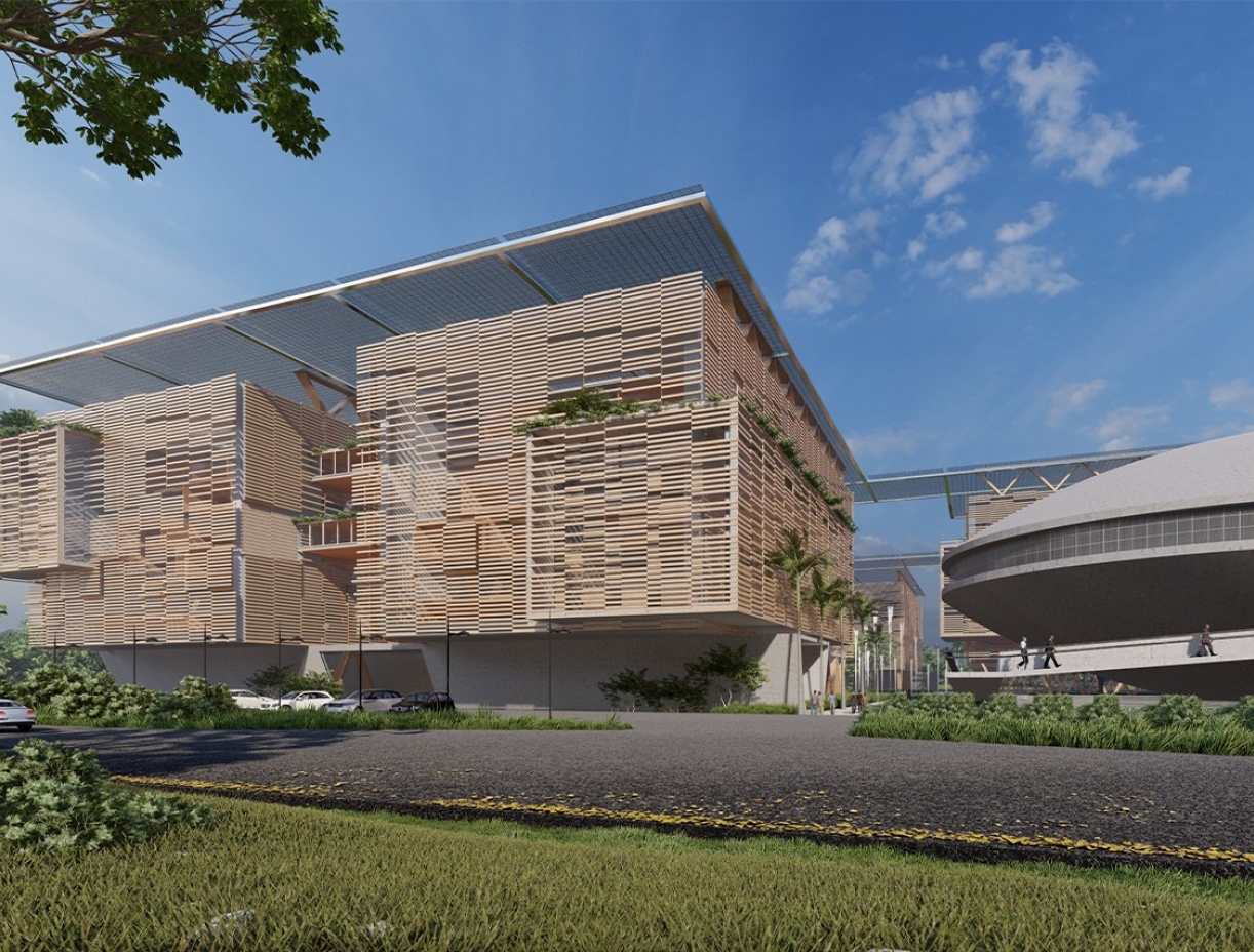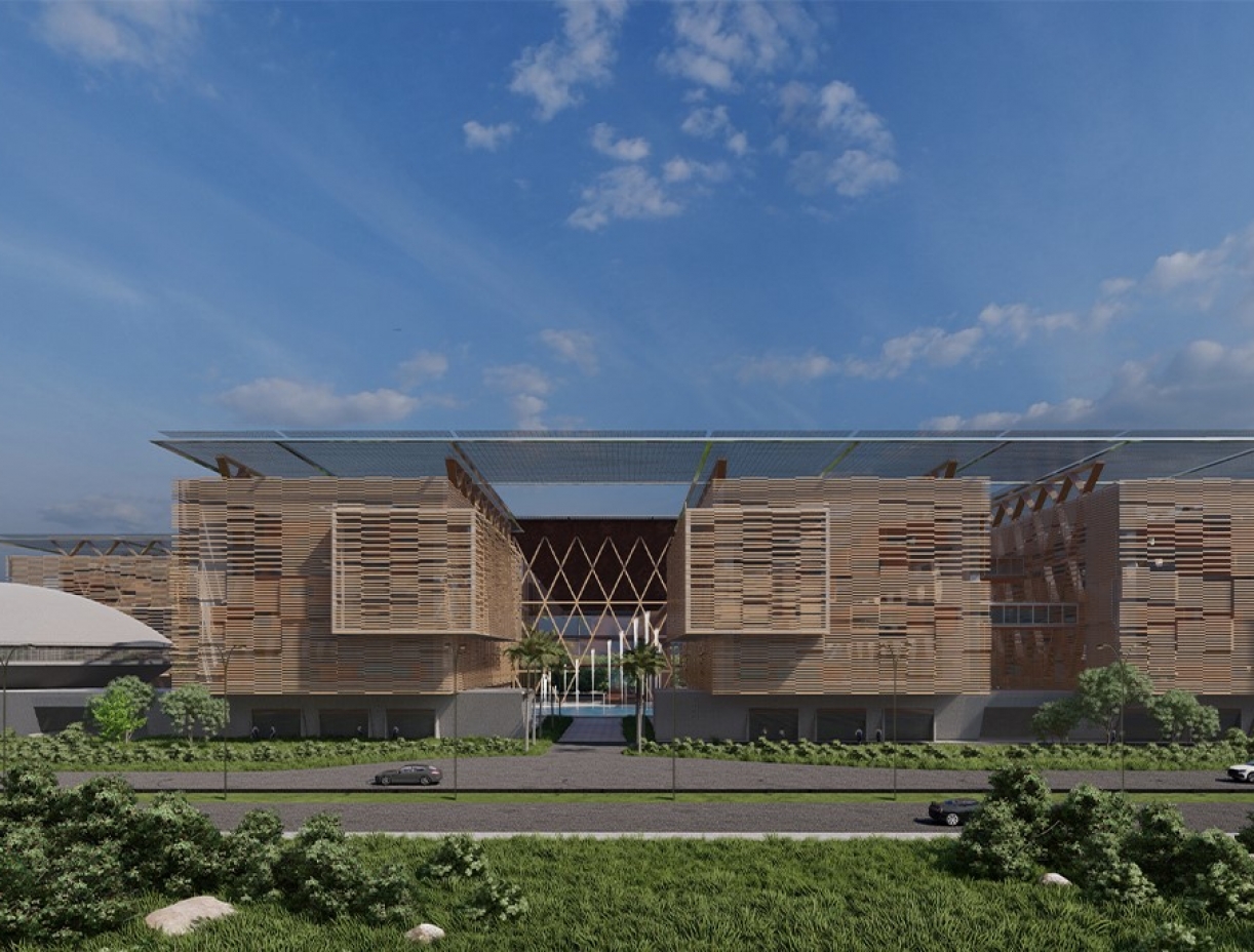 The main access leads to a central area where the focal point is the main building, symbolizing the heart of government operations. Adjacent to this, the conference area takes on an elliptical shape, evoking a sense of unity and collaboration. The entire complex is strategically organized to accommodate various ministries, each contributing to the overall efficiency and synergy of the government operations. The elliptical shape of the conference area not only creates a striking architectural feature but also promotes an inclusive environment for discussions and decision-making. The Ministerial Complex stands as a beacon of governmental innovation in Gabon, a testament to thoughtful design that fosters collaboration, efficiency, and a sense of national pride.