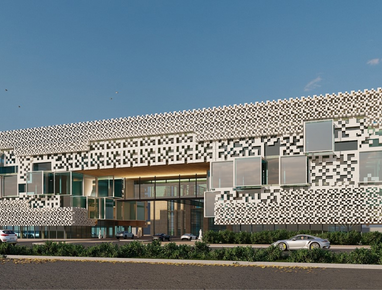 The geometric pattern of the dotted façade is carefully designed to capture and reflect sunlight into the building's interior. The dynamic interplay of light mirrors the dynamism of the digital world, reinforcing the Ministry's commitment to progress and innovation. Internally, the building houses state-of-the-art facilities and workspaces, promoting collaboration, creativity, and adaptability. The design embraces an open and flexible layout to accommodate the evolving nature of digital work environments. Technological integration is seamlessly woven into the building's architecture, emphasizing the Ministry's dedication to harnessing the power of digital advancements for societal development.