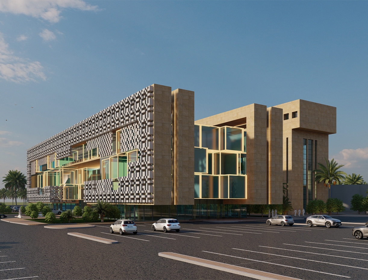 The project proposes the design of a cutting-edge Ministry of Digital building, positioned as a symbol of technological advancement and the digital age. The building's distinctive feature is its dotted façade facing the main road, serving as a dynamic visual testament to the evolution of technology. The façade employs modern geometric shapes strategically arranged to not only create a visually striking exterior but also to harness the sun's rays for sustainable and innovative purposes.