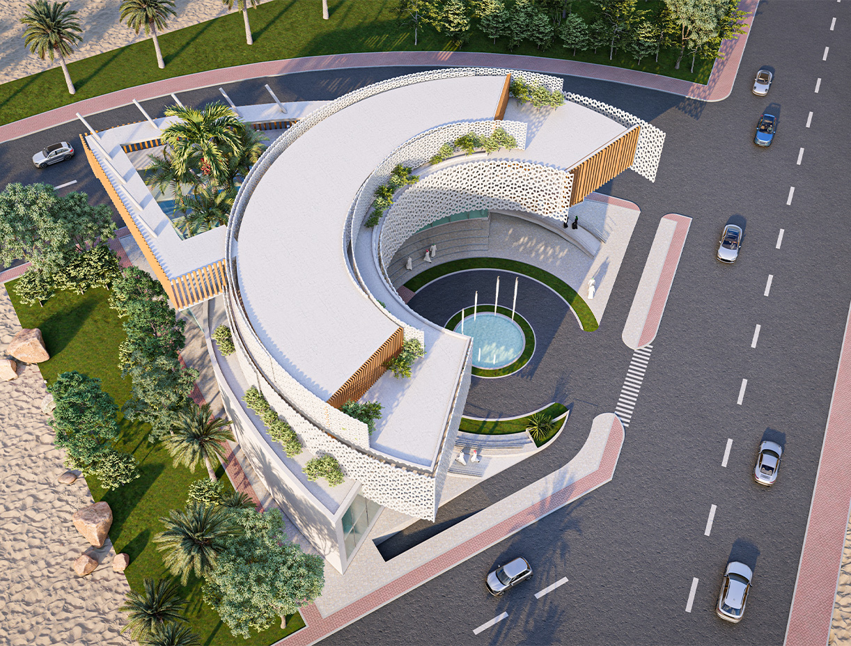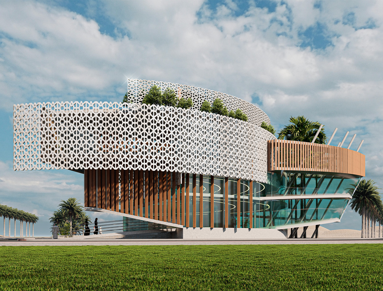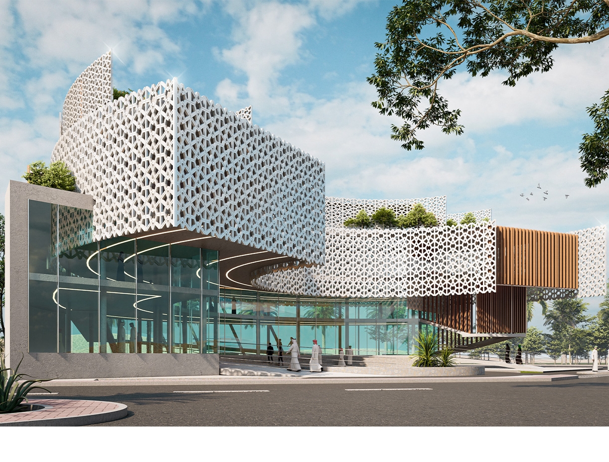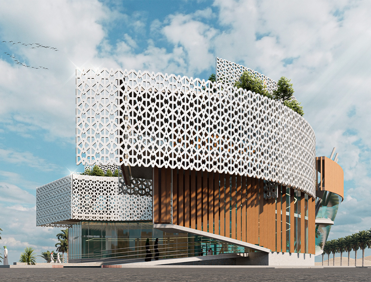 The key architectural feature is a central circular area, serving as the focal point of the design. This central hub acts as a core, with functional wings extending outward, symbolizing inclusivity and unity. The circular shape present a fluid and continuous flow of movement, emphasizing a sense of community and interconnectedness. The contemporary mashrabia elements play a crucial role in the design, serving both aesthetic and functional purposes. They contribute to the play of light and shadow, creating a visually dynamic and engaging environment. Additionally, these elements provide privacy while maintaining a connection to the surrounding landscape.