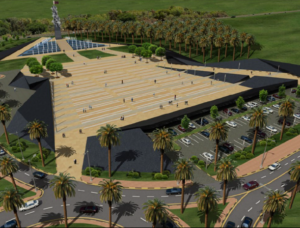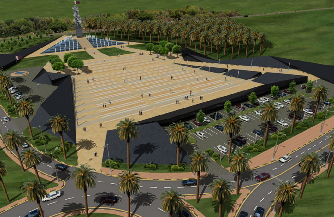 The King Hamad Memorial is designed in a stepped formation, focused towards a vertical element representing the soldiers defending the homeland and planting the country's flag. Access to the memorial is provided through lateral entrances adorned with greenery, creating an intimate atmosphere and framing the central space.