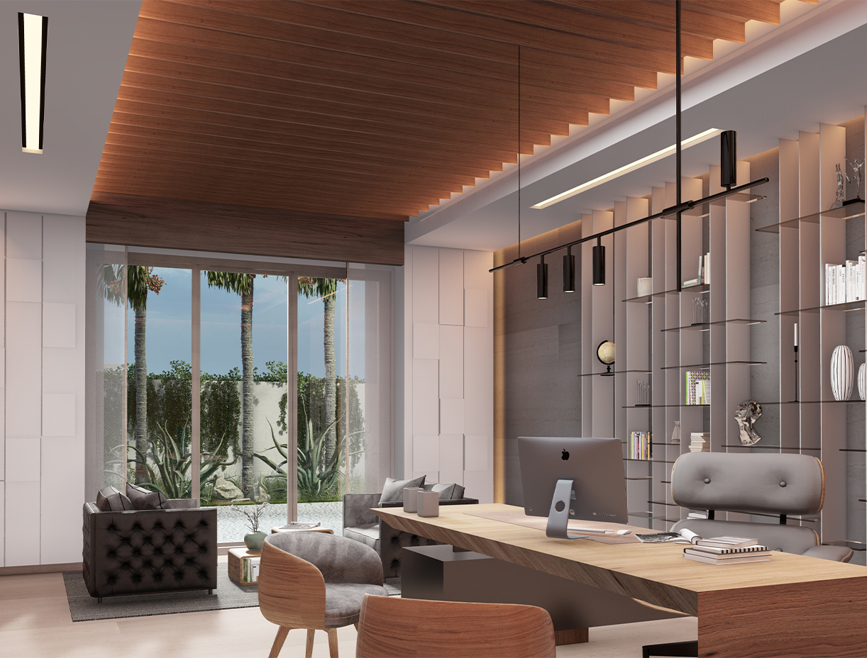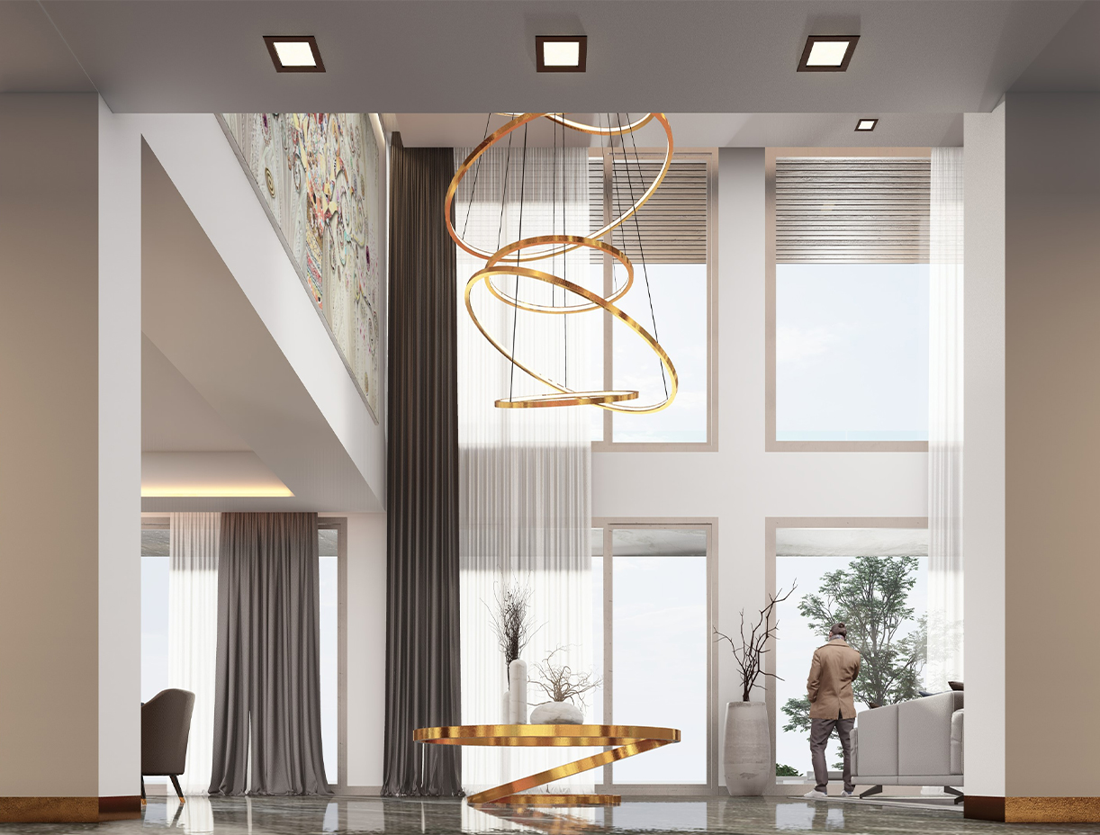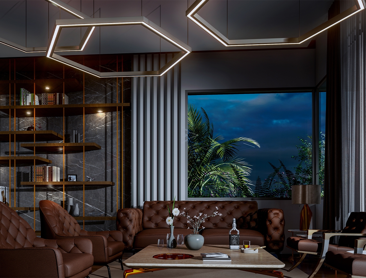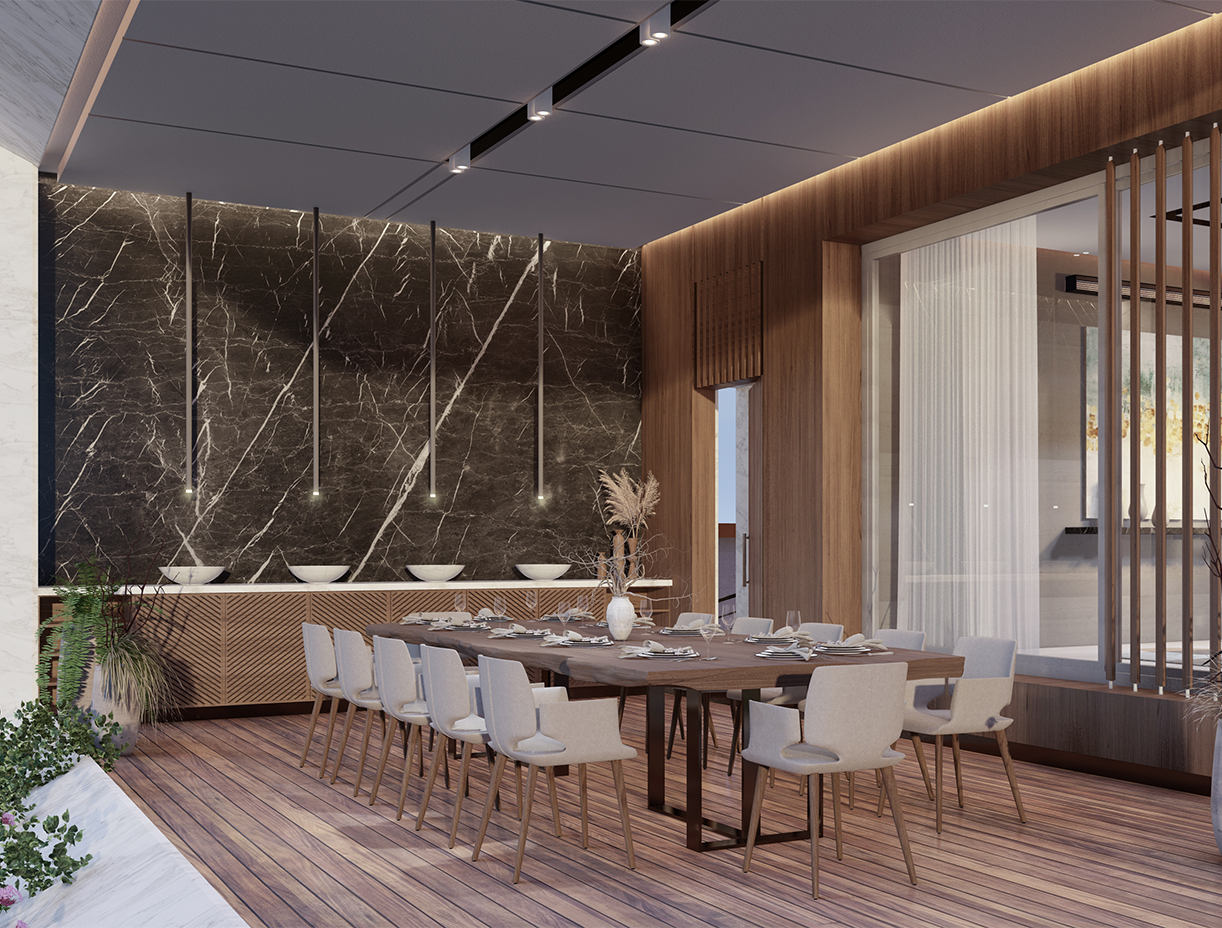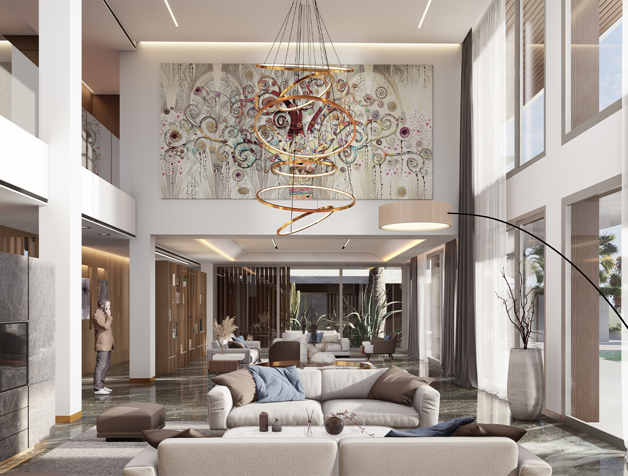 This interior design concept for a villa seamlessly blends the rich aesthetic of African influence with contemporary style, creating a luxurious space that captivates the senses. The design focuses on incorporating vertical elements to add depth and visual interest. The use of premium materials such as marble and wood enhances the opulence of the space. In the expansive living room, a sense of individuality is imparted to each corner through carefully curated furniture placement. This approach not only enhances functionality but also ensures that every area possesses a distinct identity within the overall design scheme.