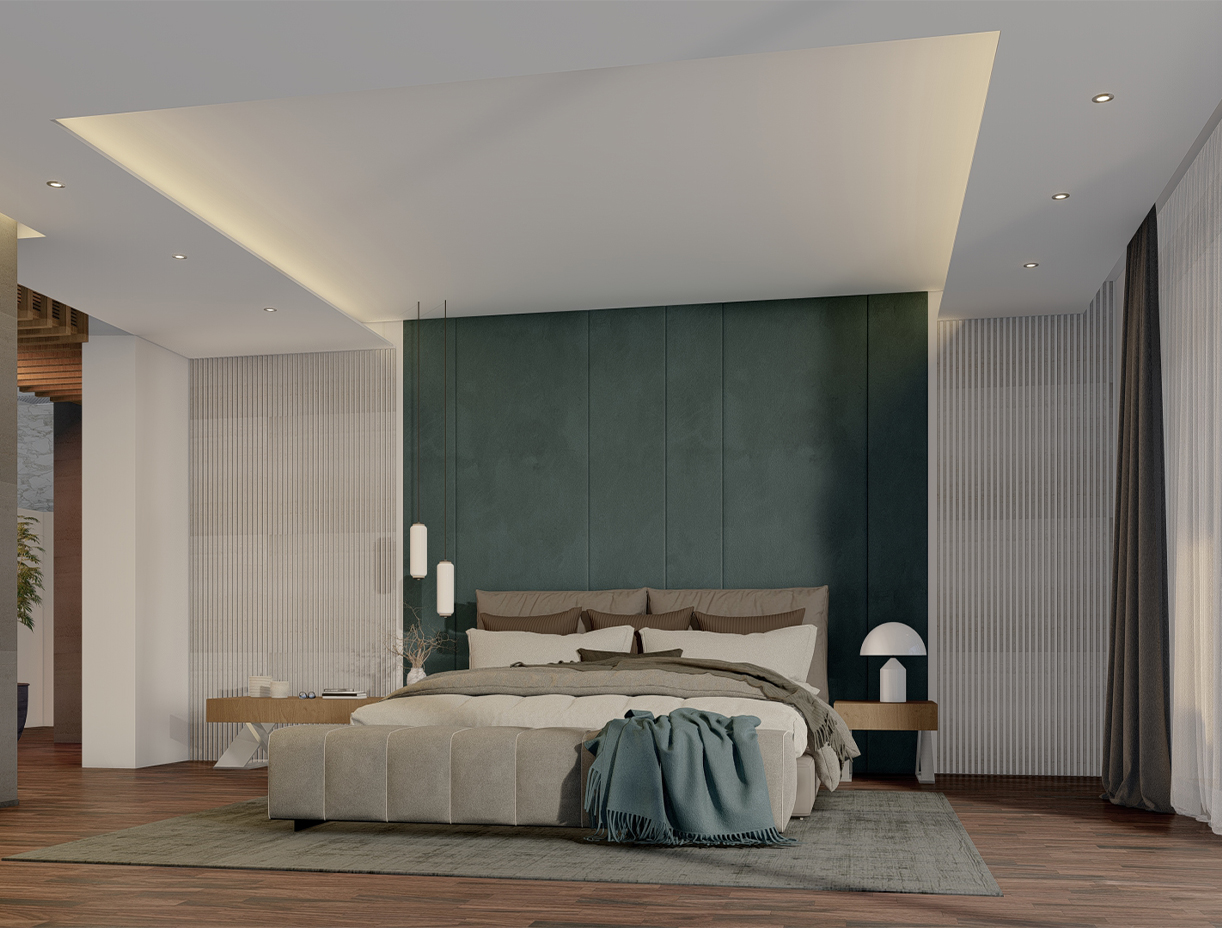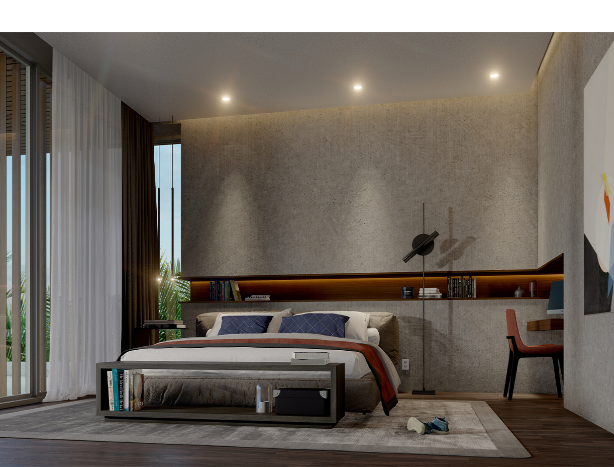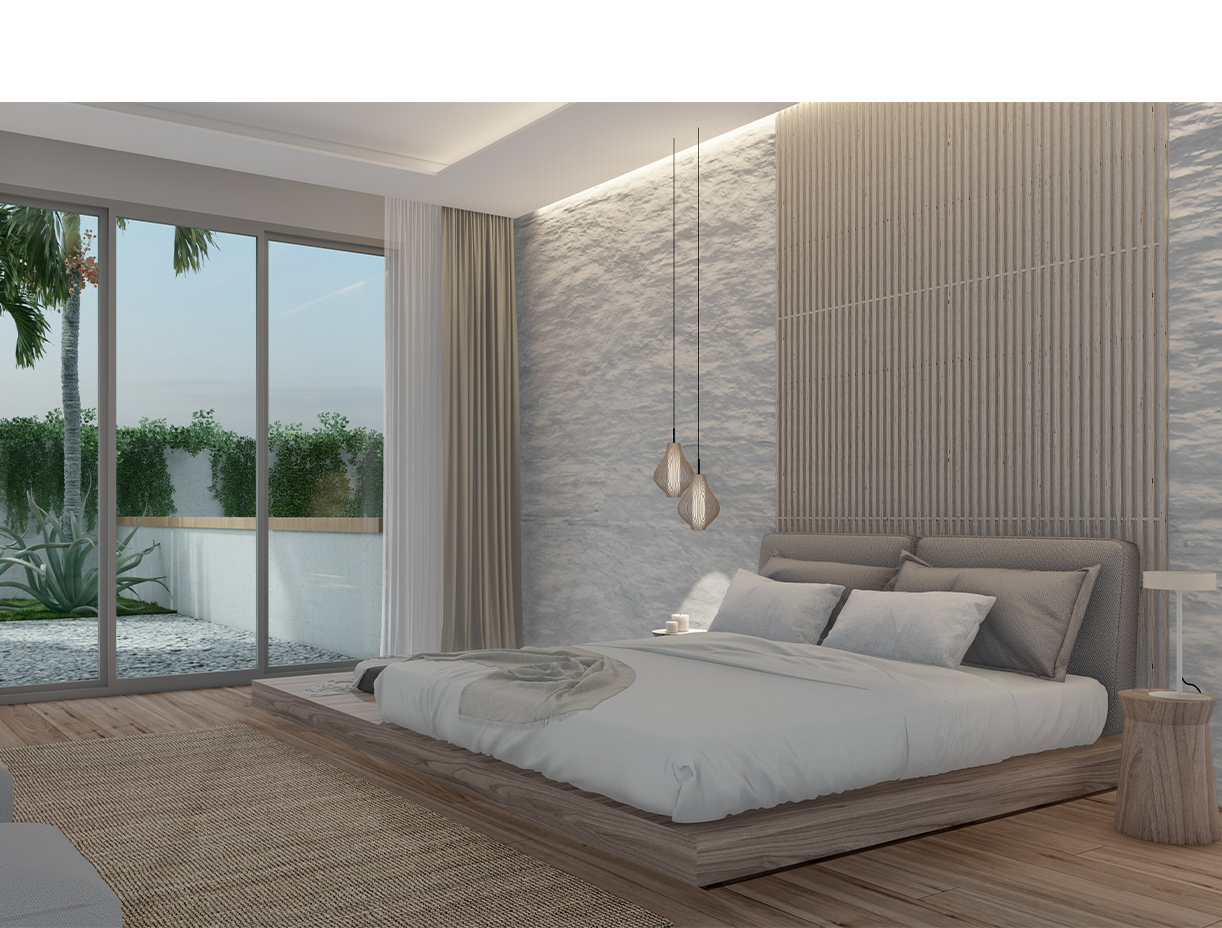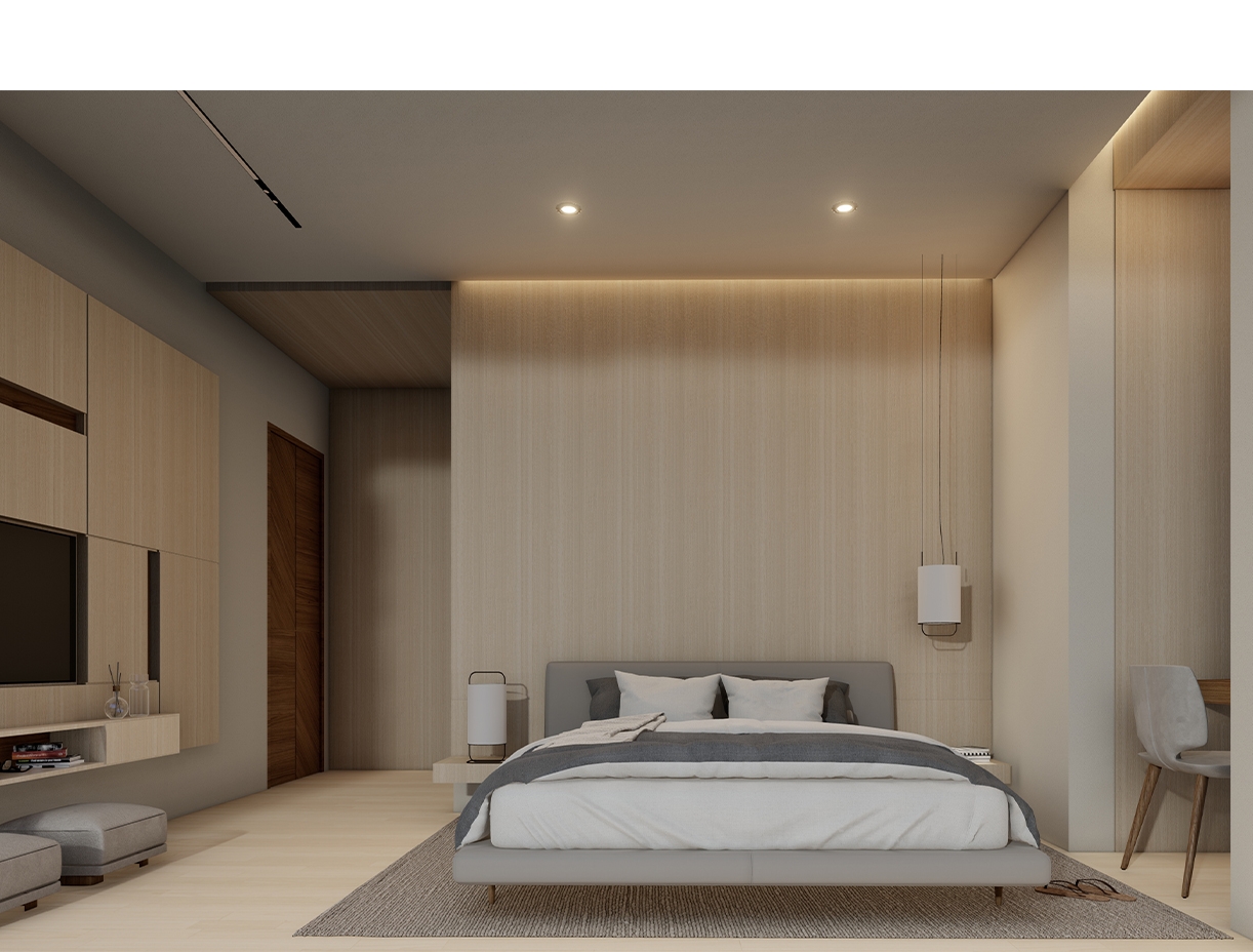 The color palette predominantly features cold tones, including white, beige, and gray, creating a serene and sophisticated ambiance. Large openings strategically placed throughout the villa allow ample natural light to flood the interiors, accentuating the elegant design elements. Moving to the bedroom, a shift in the color palette introduces warmer tones, creating a cozy and inviting atmosphere. The careful integration of both vertical and horizontal design elements adds complexity and balance to the space, ensuring a harmonious blend of styles. This unique fusion of African inspiration and contemporary design results in a villa that exudes luxury, sophistication, and a harmonious interplay of textures, colors, and spatial elements.