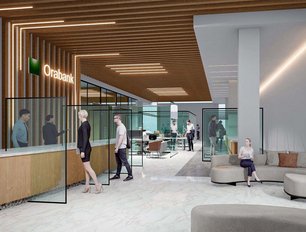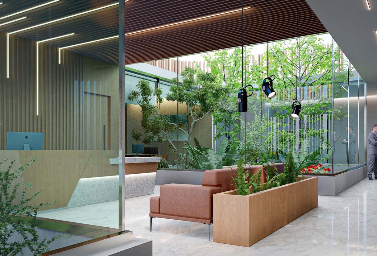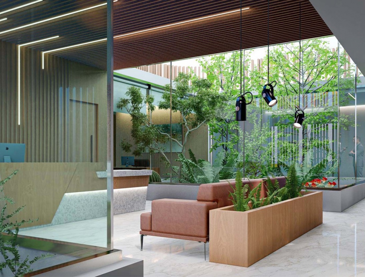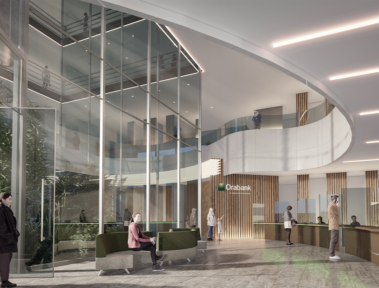 Abundant greenery is strategically placed throughout the interior, bringing nature indoors and promoting a sense of tranquility. Patios are thoughtfully integrated, allowing natural light to flood the space and creating a seamless connection between the interior and exterior. This design not only reflects a commitment to sustainability but also prioritizes the well-being of occupants by fostering a visually pleasing and comfortable banking environment.