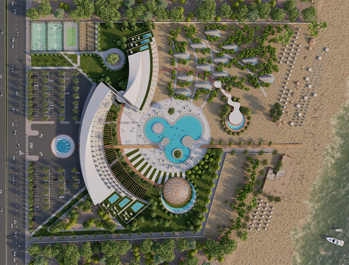 The project is a hotel featuring 250 rooms, VIP bungalows, a restaurant, leisure spaces, pools, and a beachfront development. It is designed to seamlessly integrate with the natural topography, ensuring that all rooms offer breathtaking sea views. The circular shape of the project imparts a dynamic aesthetic, creating a welcoming atmosphere centered around a water feature.