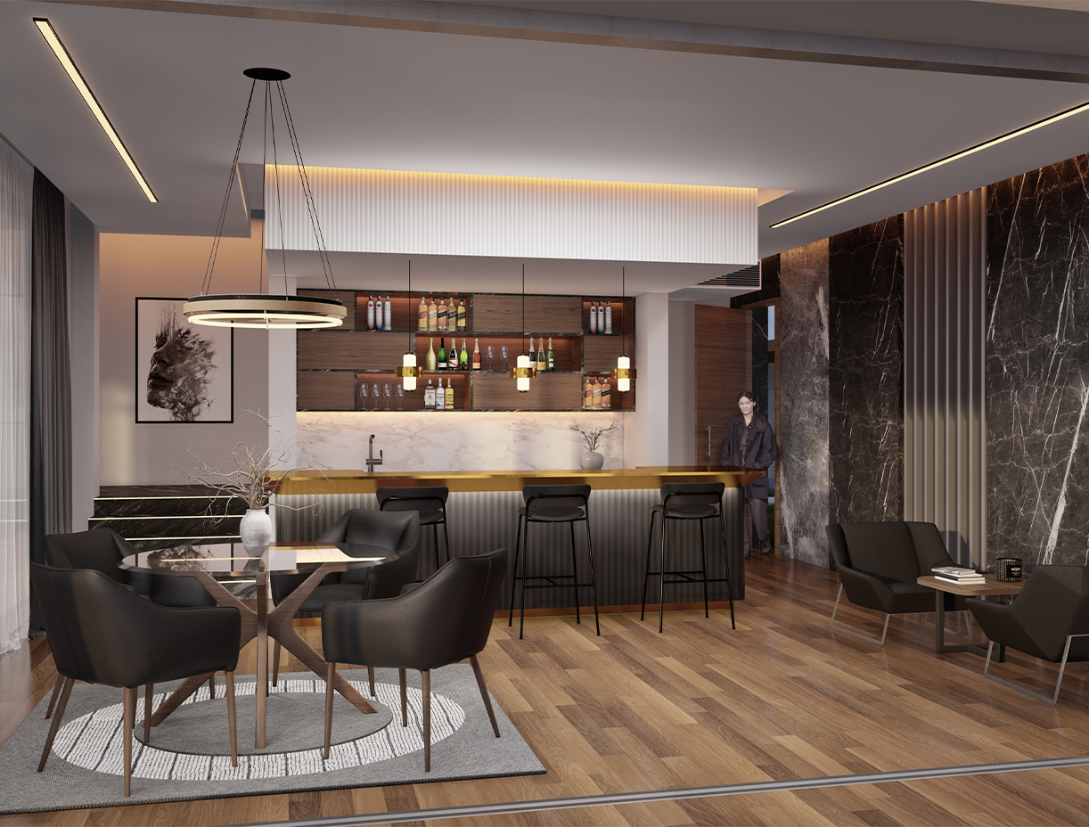 This interior design concept for a villa seamlessly blends the rich aesthetic of African influence with contemporary style, creating a luxurious space that captivates the senses. The design focuses on incorporating vertical elements to add depth and visual interest. The use of premium materials such as marble and wood enhances the opulence of the space. In the expansive living room, a sense of individuality is imparted to each corner through carefully curated furniture placement. This approach not only enhances functionality but also ensures that every area possesses a distinct identity within the overall design scheme.