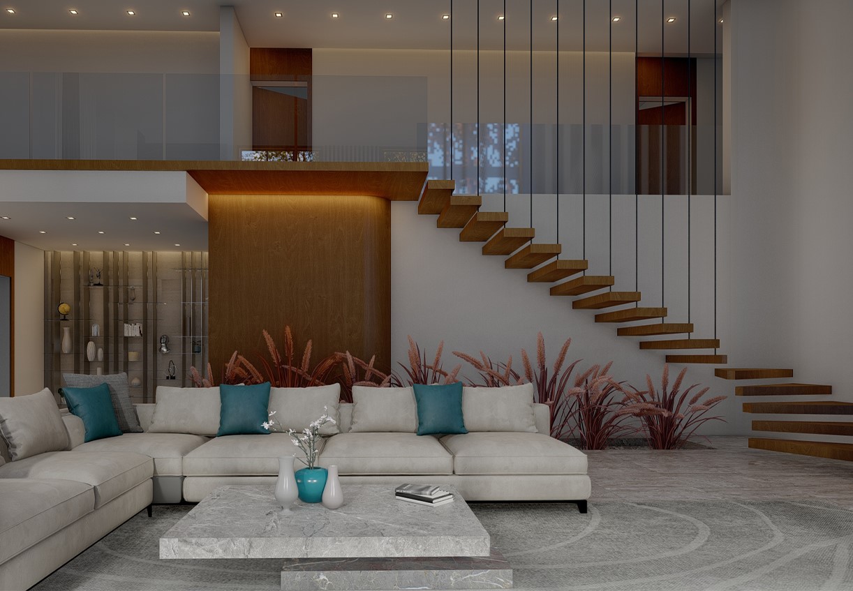 This villa in Gabon, spanning two levels, boasts a sophisticated interior design characterized by a spacious living room with a double-height ceiling. The chosen color palette revolves around cold tones, featuring pristine white walls, complemented by gray tiles that enhance the modern aesthetic. Warm-toned wood accents add a touch of coziness and elegance to the overall ambiance.